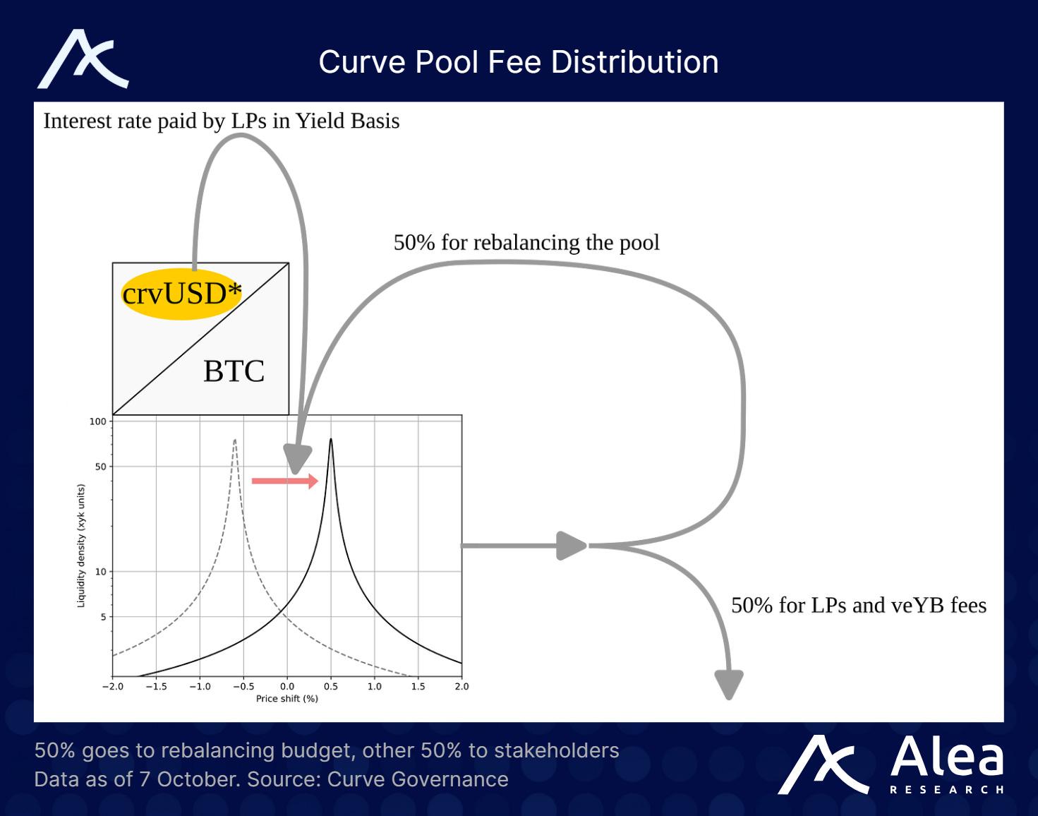 BTC/crvUSD 池的交易费用通过动态管理费的形式提供给 YieldBasis 流动性提供者 (LP) 和 veYB 持有者。其中 50% 的费用用于再平衡,剩余 50% 则根据 ybBTC 的质押份额,在未质押的流动性提供者 (LP) 和 veYB 之间分配。如果许多流动性提供者 (LP) 质押以赚取 YB 发行量,管理费就会增加,从而向 veYB 支付更多费用。但如果质押数量较少,流动性提供者 (LP) 获得的 BTC 计价费用就会更多。