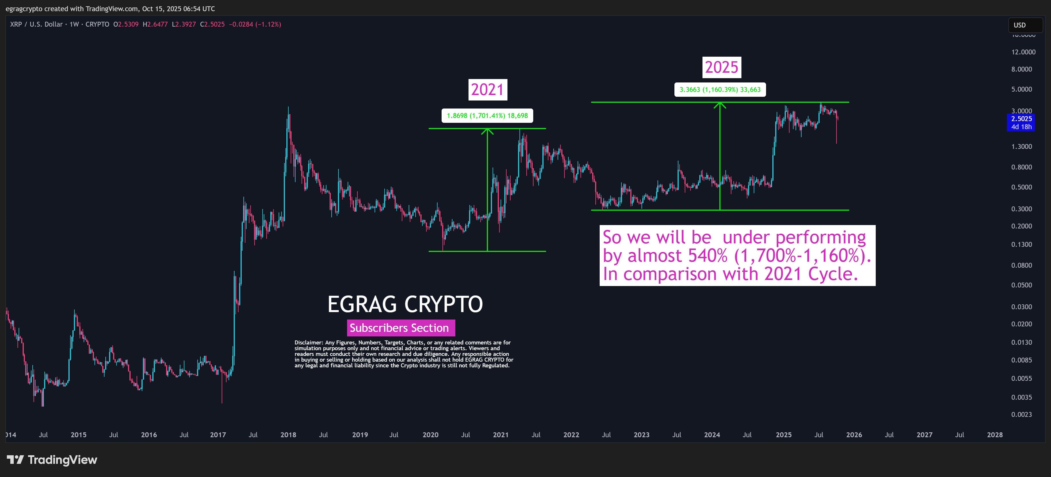 有趣的是,EGRAG 还呼吁关注更广泛的市场周期。具体来说,市场分析师指出在 2021 年周期中,XRP获得了约从最低点到 1.96 美元的最高点上涨了 1,700%。尽管美国证券交易委员会的诉讼给其价格行动带来了压力,但这种情况仍然发生了。