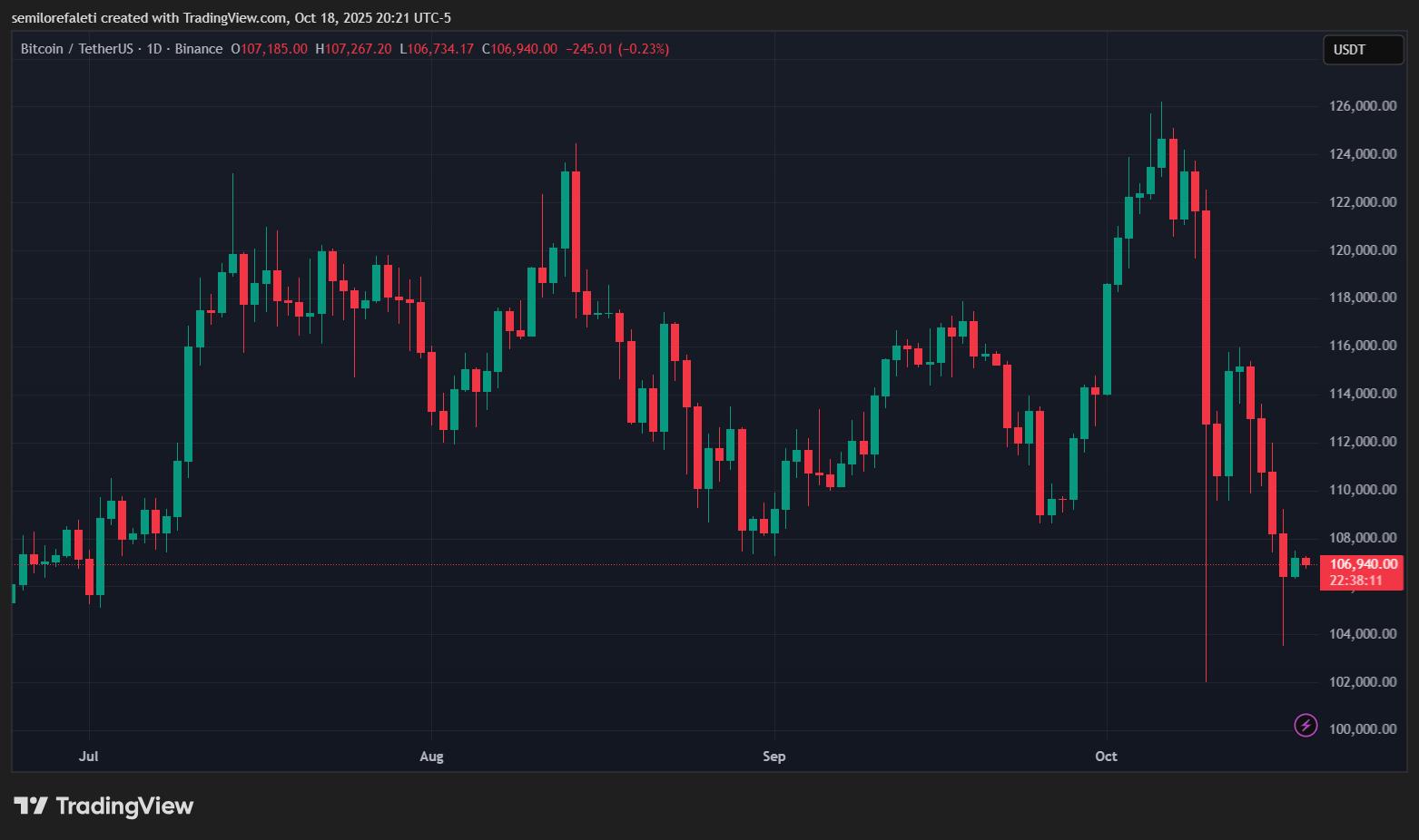 截至本文撰写时,比特币交易价格为106,970美元,过去24小时内下跌0.29%。月线图显示,比特币下跌了8.32%,目前该主流加密货币正努力确立其预期的“十月上涨”看涨形态。不过,Coincodex分析师预测市场即将反弹,五天内目标价将达到124,172美元。