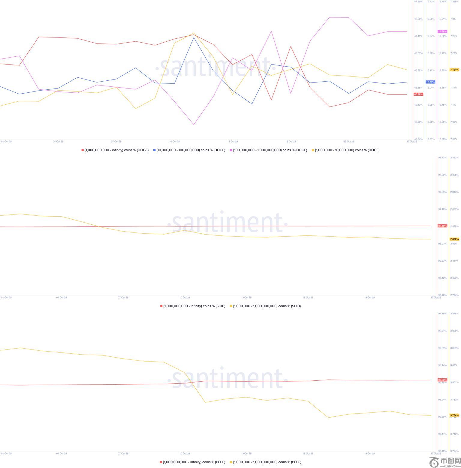 Santiment 数据显示,持有超过 10 亿枚 DOGE 代币的投资者已将其持有量从 10 月 1 日的 46.75% 降至可用供应量的 46.28%。