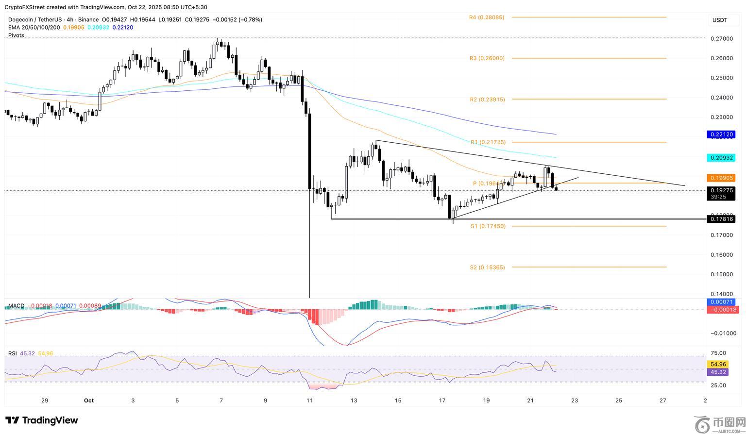 狗狗币未能守住0.2000美元的心理支撑位,导致4小时图创下新低,并与周四高点形成一条下降趋势线。截至本文撰写时,狗狗币周三下跌近1%,延续了前一天2.87%的跌幅。