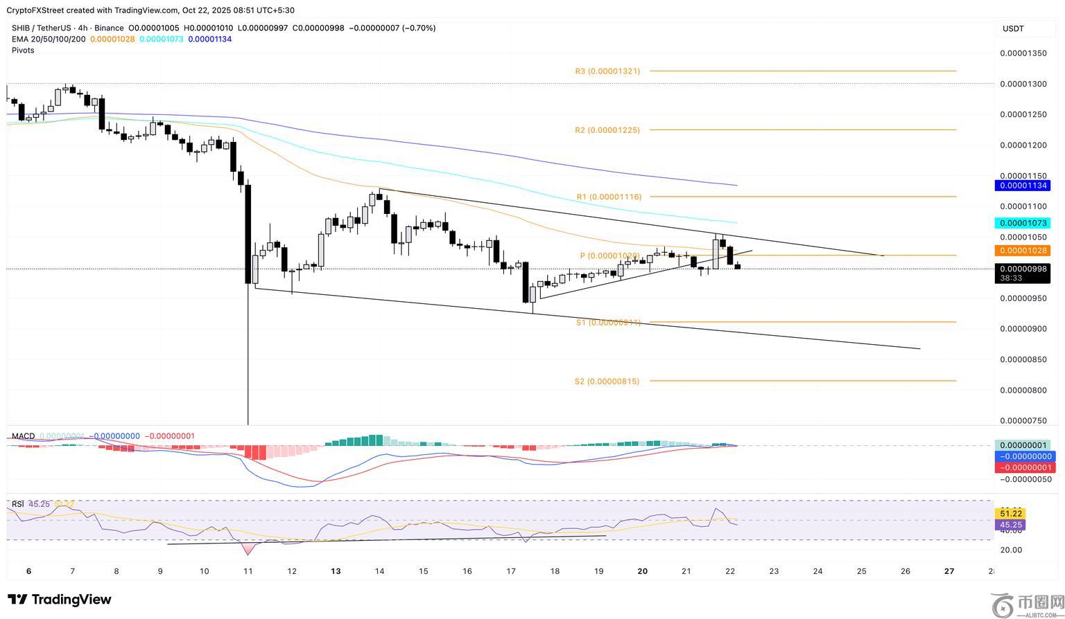 截至周三发稿时,Shiba Inu 的交易价格低于 0.00001000 美元的心理关口,有可能在 4 小时图上形成的下降通道内进入下行周期。SHIB 的直接支撑位位于 S1 枢轴点 0.00000911 美元,略高于下降通道的底部趋势线。