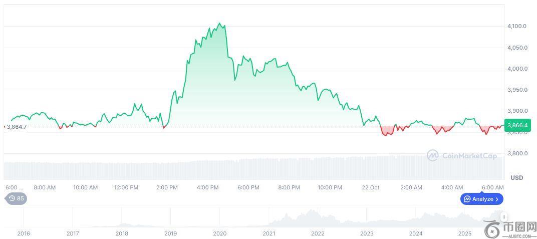 根据CoinMarketCap以太坊(ETH)交易价格为 3,866.04 美元,市值为 4,666.2 亿美元,占市场份额的 12.76%。近期交易量达到 491 亿美元。尽管价格在 24 小时内下跌了 0.42%,但在过去 90 天内上涨了 8.04%。这些波动趋势反映了更广泛的市场波动性。