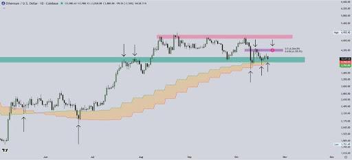 以太坊在区块链性能和价格方面表现出色。分析师 Luca 表示著名的ETH 价格持续围绕绿色标记的较高时间框架支撑位区间盘整,该区间此前在 2024 年一直充当着强劲阻力位,并形成了多个局部顶部。从阻力位到支撑位的转变现在与每周牛市支撑带相一致,该区域一直以来都是可靠的支持在过去的几个月里。