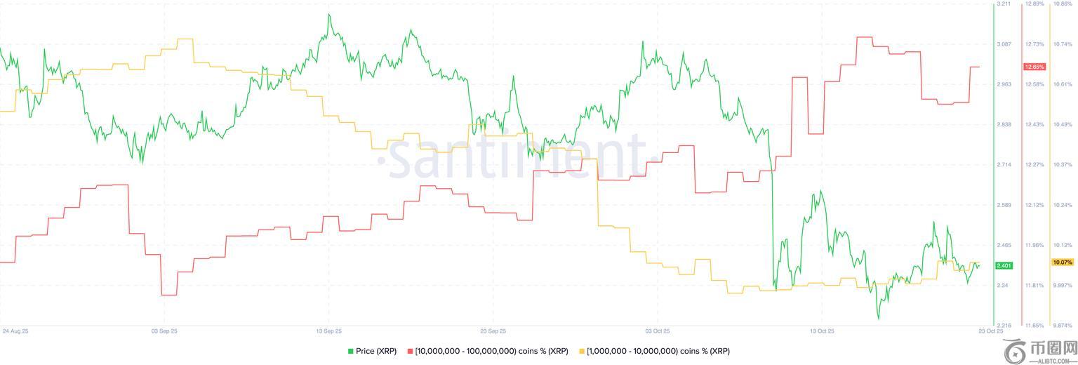 随着价格波动,大量 XRP 持有者,尤其是持有 100 万至 1000 万枚 XRP 的“鲸鱼”正在大举买入。Santiment 数据显示,这些“鲸鱼”在 10 月 10 日去杠杆事件发生前就开始购买 XRP,该事件导致 190 亿美元的加密资产被清算。目前,“鲸鱼”持有 XRP 总供应量的 12.65%,高于 10 月 6 日的 12.16%。