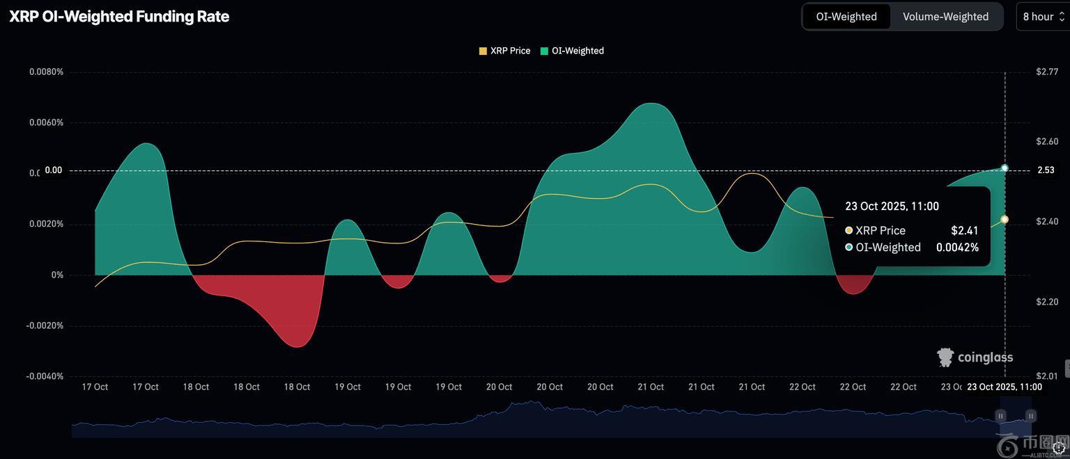 与此同时,散户对XRP的兴趣也在价格波动中有所增长。CoinGlass数据显示,周四期货未平仓合约(OI)加权融资利率为0.0042%,高于周三的-0.0007%。