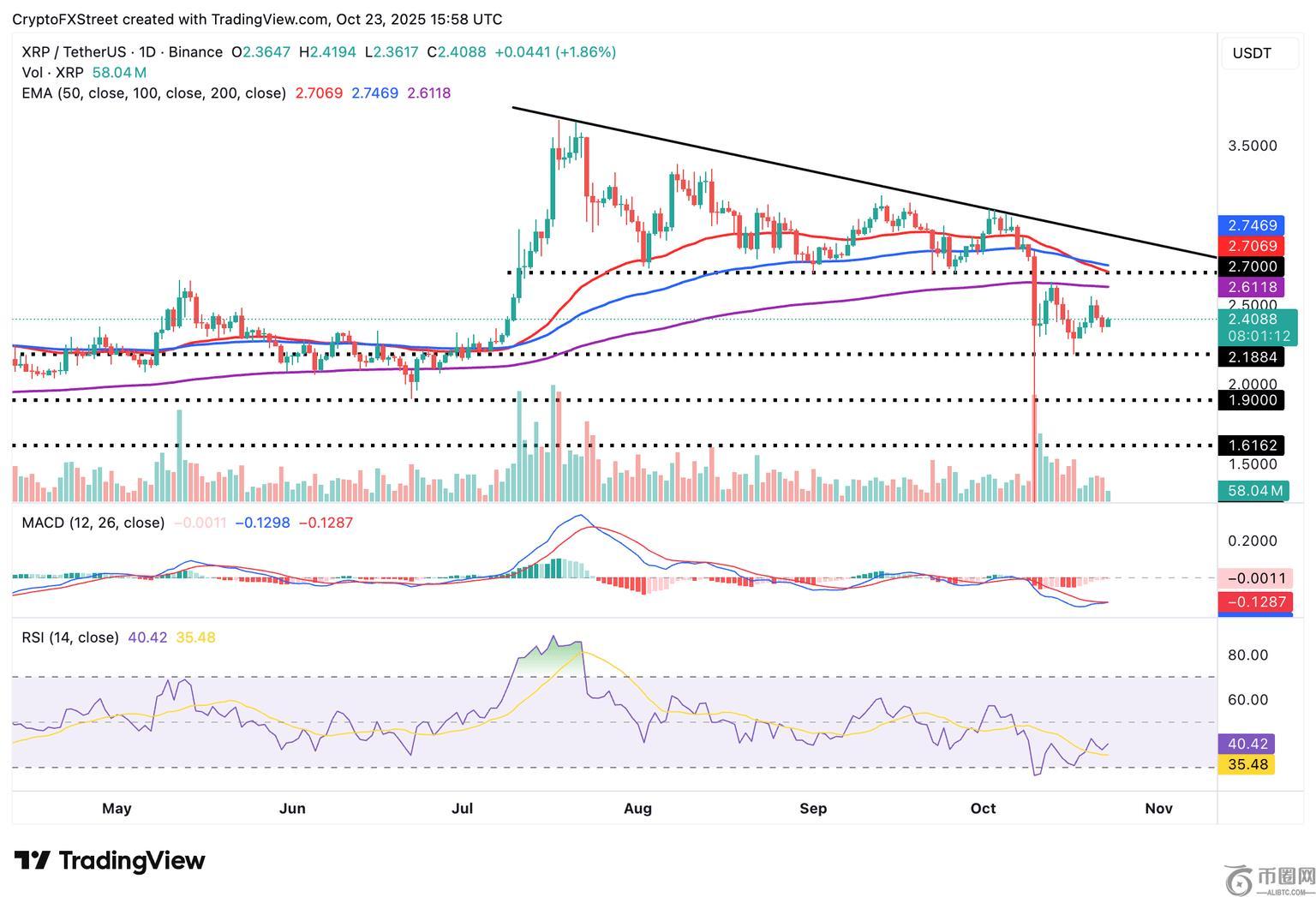 随着更广泛的风险情绪改善,XRP 正在巩固其 2.40 美元的短期支撑位加密货币市场。日线图上,相对强弱指数 (RSI) 处于 40 的上行趋势,表明看涨势头正在增强。交易者应密切关注 RSI,因为 RSI 回升至中线上方则表明势头强劲。
