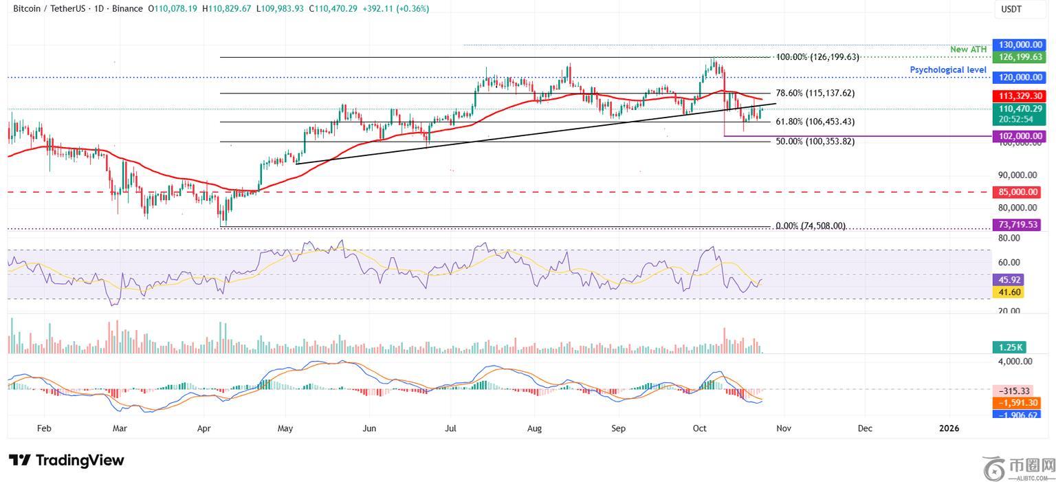 然而,如果 BTC 收盘价低于 106,453 美元,则可能延续跌势,跌向 10 月 10 日的低点 102,000 美元。