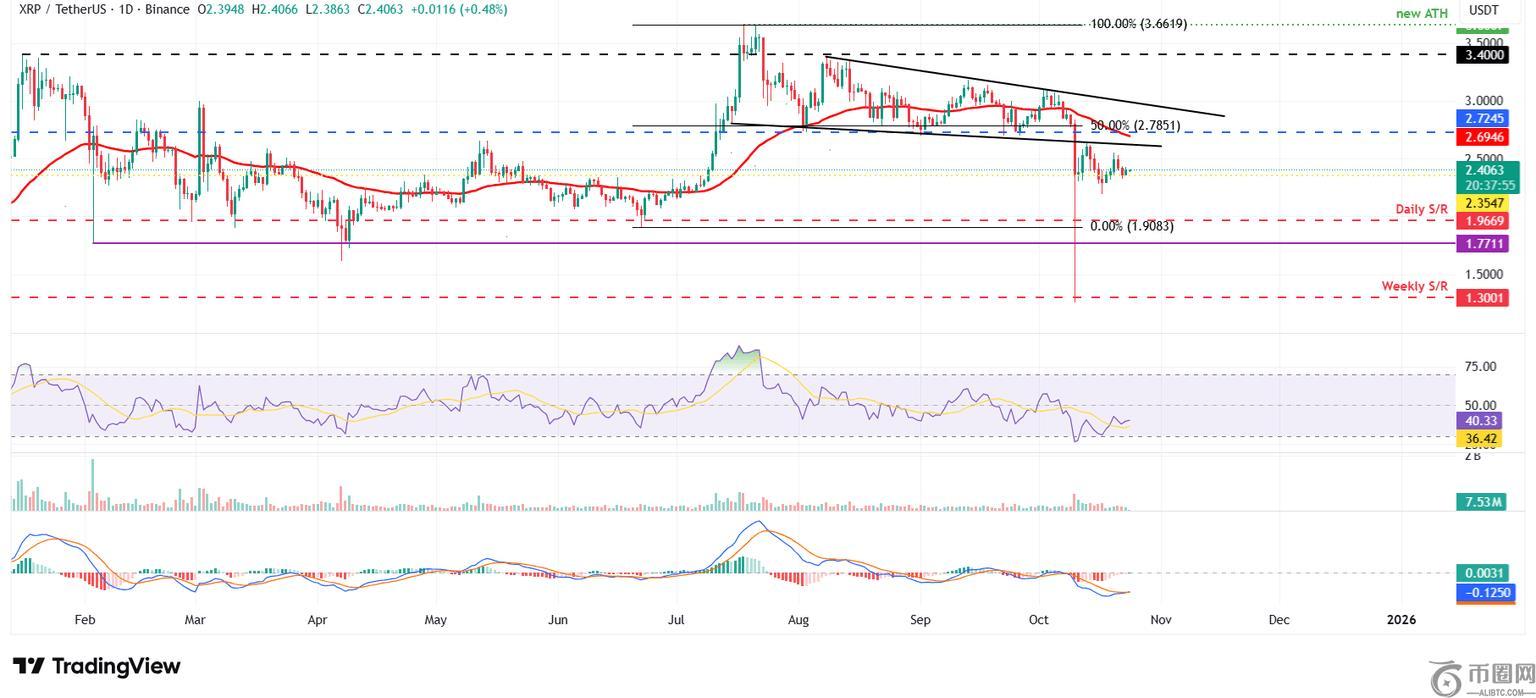 XRP 本周开盘上涨,周一上涨 4.35%,收于 2.35 美元的日阻力位上方。然而,XRP 在接下来的两天内下跌,抹去了周一的涨幅,并重新测试了 2.35 美元的日阻力位。XRP 在 2.35 美元附近找到支撑位,并在周四略有回升。截至周五撰写本文时,XRP 正在延续涨势,交易价格突破 2.40 美元。