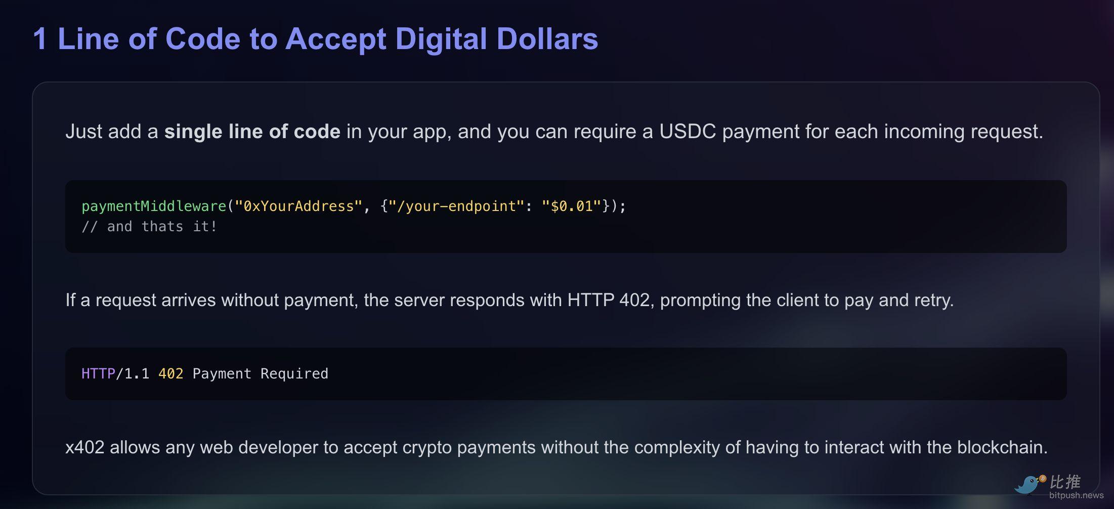 另一方面,x402 不要求你接入复杂的 SDK,不需要调用专有钱包,不依赖中心化的验证结构。只要你是 Web 开发者、懂 HTTP 和 API 的逻辑,你就能在几小时之内为你的服务添加 x402 支付功能。这种极低的工程门槛,是技术标准能否“爆发式传播”的必要条件。