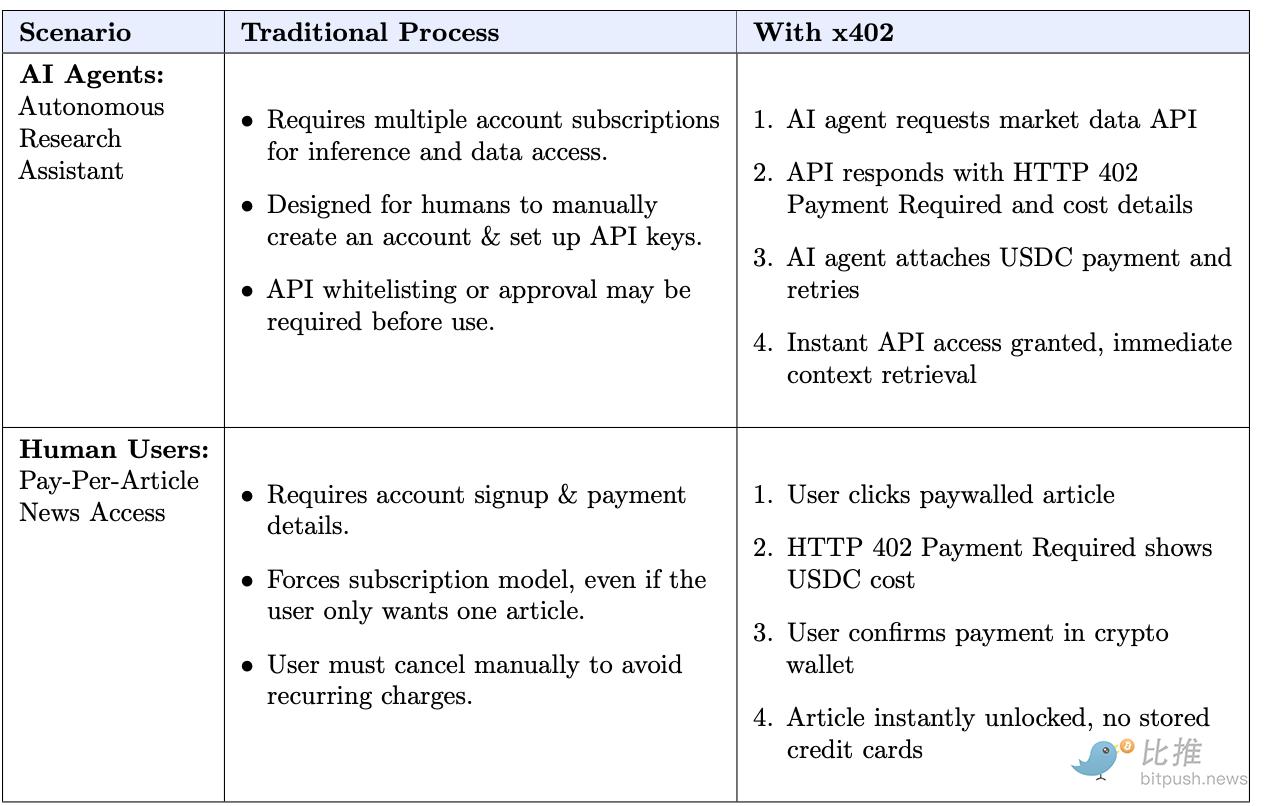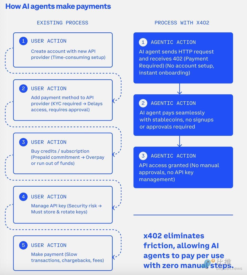 简单来说,它想要建立一种“HTTP 原生的链上支付流程”。任何一个网页、API、Bot、AI Agent 都可以在返回 402 状态码时告知客户端“你需要先付款”,并提供标准化的链上支付信息。客户端完成付款后,把支付凭证带入下一次请求中,服务器再进行验证并返回服务内容。