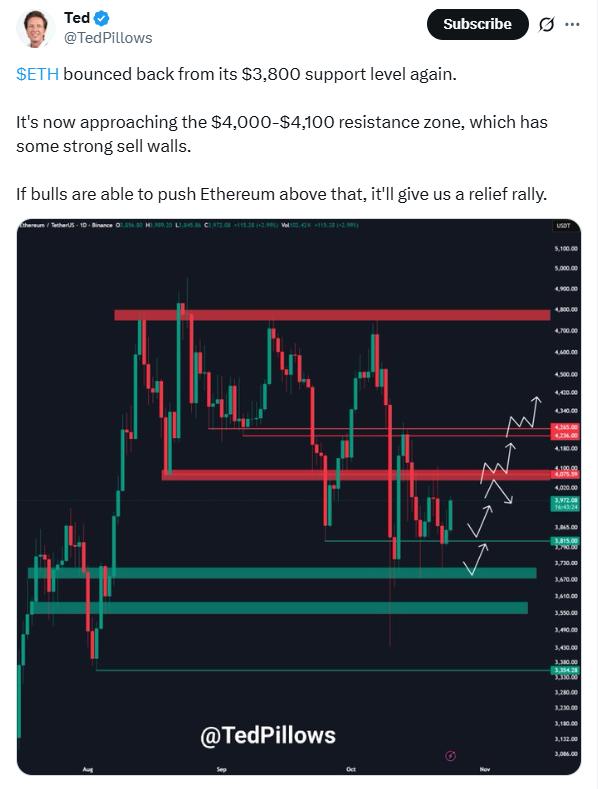以太坊(ETH)价格已多次测试3,800美元区域。持续的测试表明,买家愿意在回调期间入市。