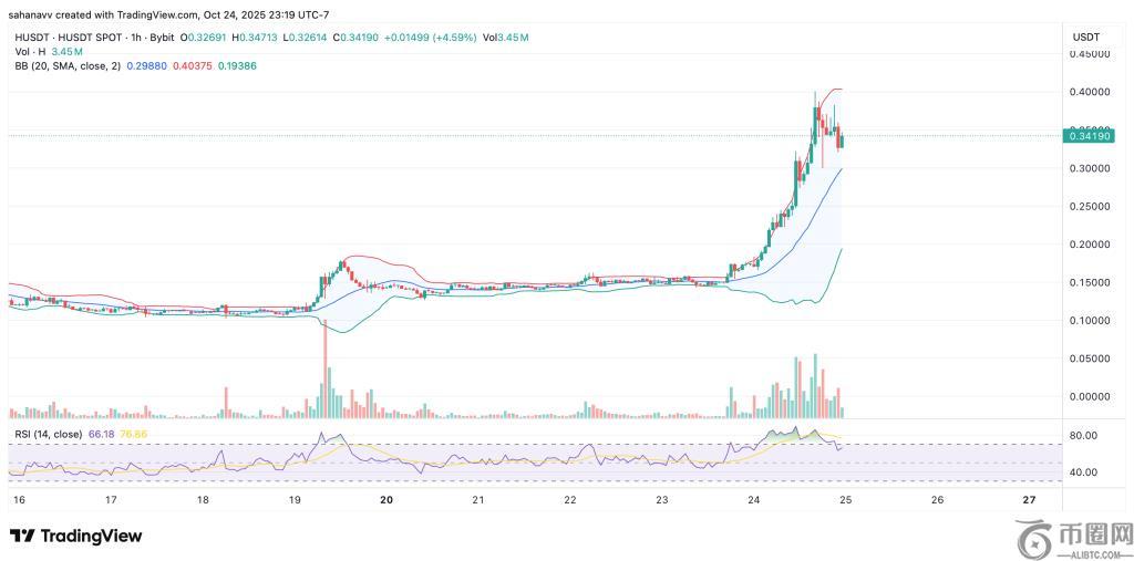 HUSDT 呈现强劲看涨突破,价格飙升至布林带上轨上方,表明市场波动性高且买盘动能强劲。RSI 为 66,表明超买状况温和,但并非极端。成交量激增证实了涨势期间的强劲参与。短期内可能回调至布林带中轨(约 0.28 美元),之后再继续上涨。如果动能维持在 0.34 美元上方,下一个阻力位目标位于 0.40 美元至 0.42 美元附近,而支撑位位于 0.29 美元附近,可能构成买入机会。