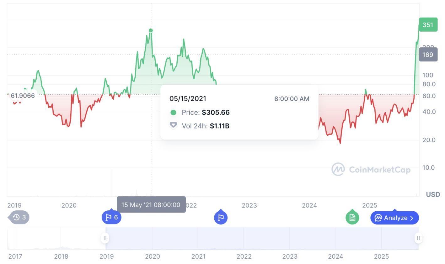 这一价格较 2021 年 5 月 8 日 319 美元的收盘价高出 11.5%,但根据 CoinGecko 数据,较近九年前创下的 3191.93 美元历史峰值,仍下跌 88%。