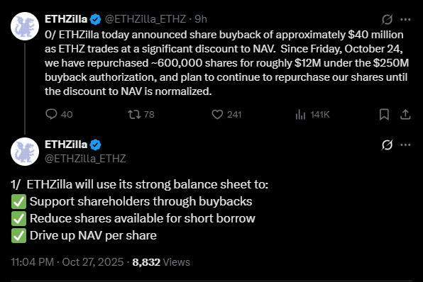 第七大以太坊[ETH]DAT(数字资产库)公司 ETHZilla Corporation(ETHZ),宣布它出售了价值 4000 万美元的 ETH 来资助股票回购。