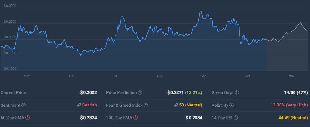 狗狗币近期在关键阻力位下方盘整,目前交易于0.20美元附近。分析师指出,狗狗币已守住0.20美元附近的支撑位,并显示出在可能突破之前企稳的迹象。其市值