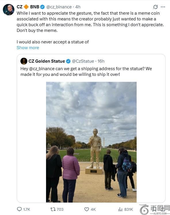 币安创始人赵长鹏(CZ)拒绝了一尊与网络迷因币捆绑在一起的金像,并呼吁人们不要购买。