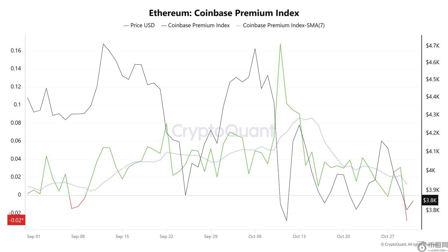 根据CryptoQuant的数据,以太坊Coinbase Premium指数周四跌至-2.8%,创下自9月9日以来的首次负值。这一跌幅表明,以太坊在Coinbase上的交易价格低于大多数加密货币交易所,暗示美国投资者对以太坊现货的需求有所放缓。