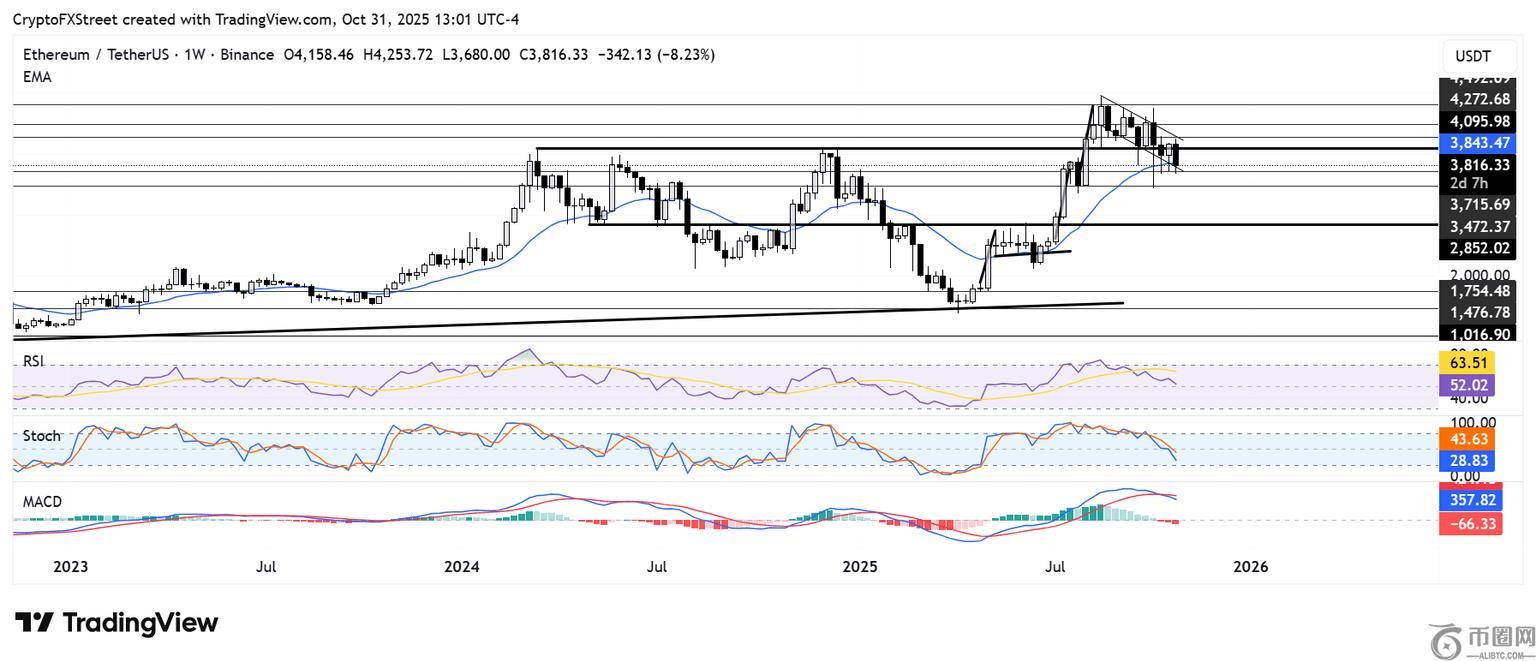 在周线图上,以太坊 (ETH) 在触及 3700 美元附近的支撑位后,目前处于下降通道内交易。如果跌破 3700 美元,这种热门可能跌至 3470 美元。更下方是 2850 美元附近的历史支撑位。