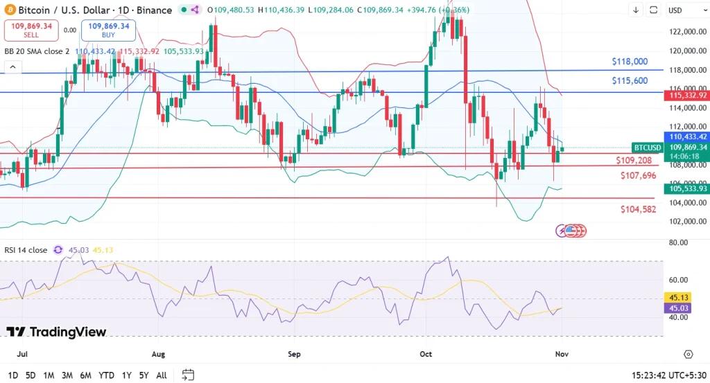 比特币价格该股本周下跌1.45%,报110,163.62美元,但24小时涨跌幅基本持平。图表显示,该股在109,200美元上方出现一系列更低的高点,与收窄的布林带走势密切相关——这是波动性加剧的典型先兆。由于24小时内成交量下降2.7%,交易员们正准备迎接一波较大的单边行情。