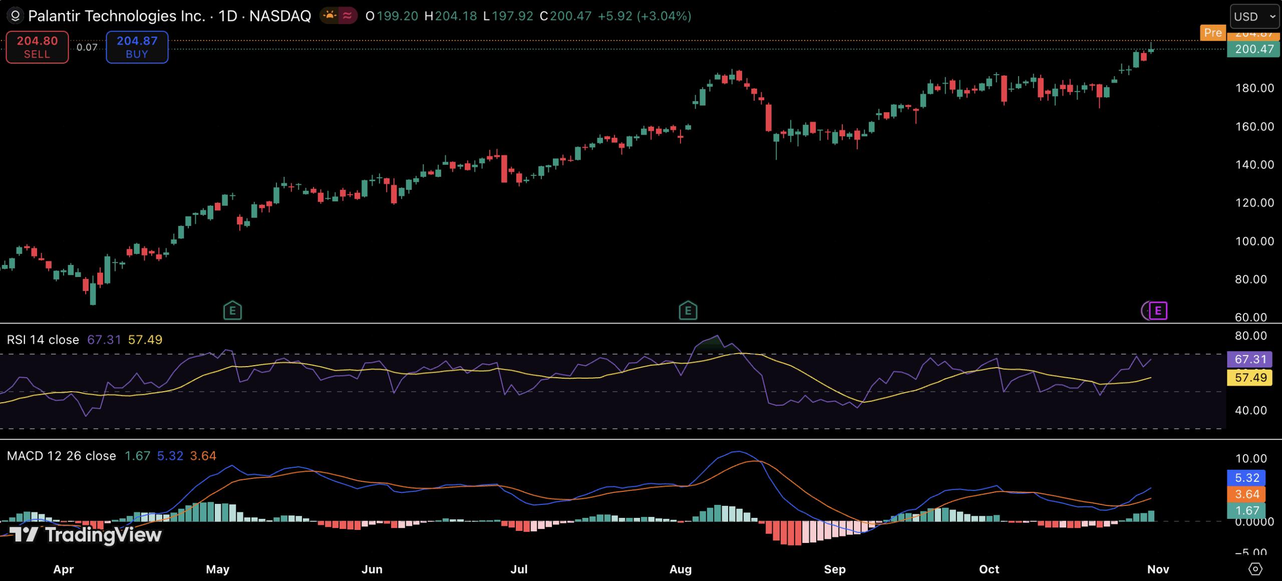 交易活动急剧加剧,促使CNBC的吉姆·克莱默在财报发布前几个小时评论X节目时表示,“Palantir股价在204美元附近的交易量简直疯狂”。股价的飙升表明交易员们正在为该公司再次超出预期的盈利做准备——但如果业绩不及预期,风险也会随之增加。