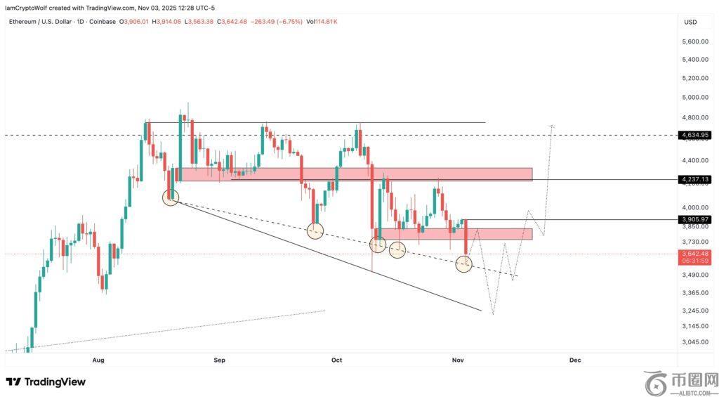 如果以太坊未能守住该区域,则可能再次下跌,重新测试 3500 甚至 3400 附近的下行趋势线,之后才会出现更强劲的反弹。整体结构表明市场处于吸筹阶段。下边界的圆弧触及暗示着买家在每次下跌时都在入场。