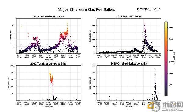 2025 年 10 月市场清算潮:近期虽也出现过拥堵(如 WLFI 代币发行、10 月 10 日清算潮),但影响范围已大幅缩小。手续费极少突破 1000 Gwei,且能快速恢复正常,这体现了 Layer-2 的分流作用与 Layer-1 持续的容量提升效果。