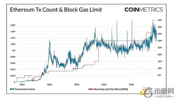2025 年,以太坊日交易量已突破 180 万笔,而平均交易手续费降至多年低点。如下图所示,区块燃气限制近期已提升至 4500 万,未来计划进一步提升至 1 亿及以上,以支持随活动增长而扩大的交易量。