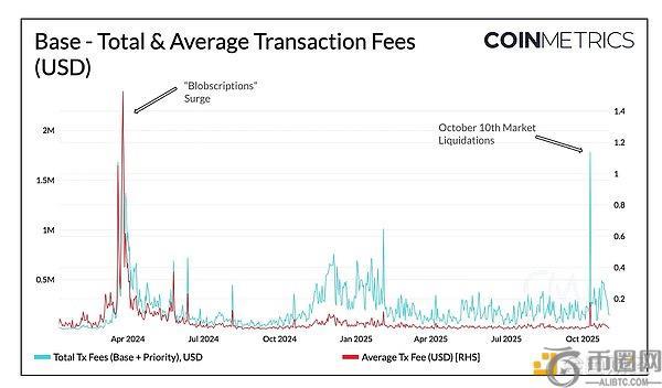 2025 年 10 月市场清算潮:10 月 10 日市场波动期间,清算活动激增促使 Base 的总交易手续费接近 180 万美元,但平均交易成本仍低于 0.20 美元。由于当年早些时候 Pectra 升级将 Blob 容量翻倍,Blob 手续费维持低位,使得 Base 能在高交易量下不提高用户成本。
