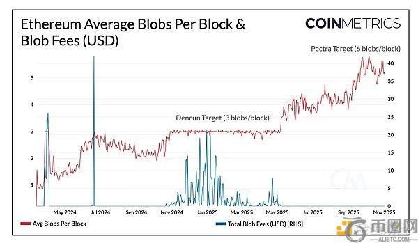 2024 年 4 月、2025 年初曾出现 Blob 手续费飙升,原因是 Blob 空间刚推出时,需求超出初始容量。后续 Pectra 升级及即将到来的 Fusaka 升级,已稳定了 Blob 定价,并构建了更灵活的数据层,支持 Layer-2 持续增长。