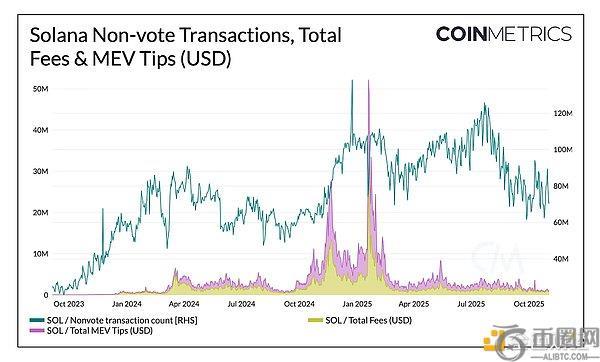 下图展示了 Solana 的非投票交易活动(蓝色),以及交易手续费与链外 MEV(最大可提取价值)小费(黄色与紫色),共同反映了交易需求与网络收入随用户活动、市场环境变化的演变过程: