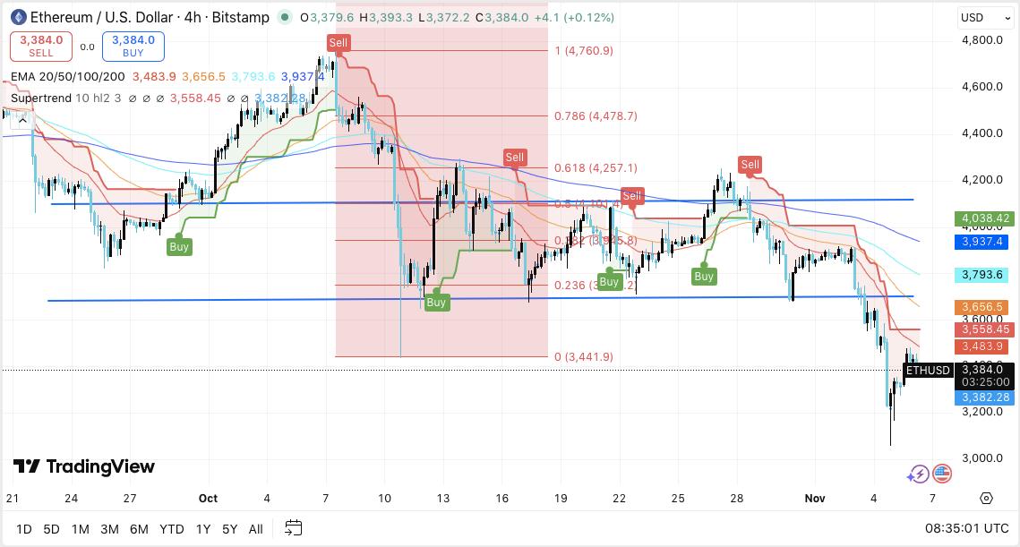 进入11月,关键价位依然清晰。上行阻力位分别位于3,558美元、3,656美元和3,793美元,这些价位与短期阻力群和EMA交叉点相吻合。若能有效突破3,937美元(100日均线),以太坊有望进一步上涨至4,038美元和4,257美元,这两个价位分别是200日均线和0.618斐波那契回撤位的交汇点。