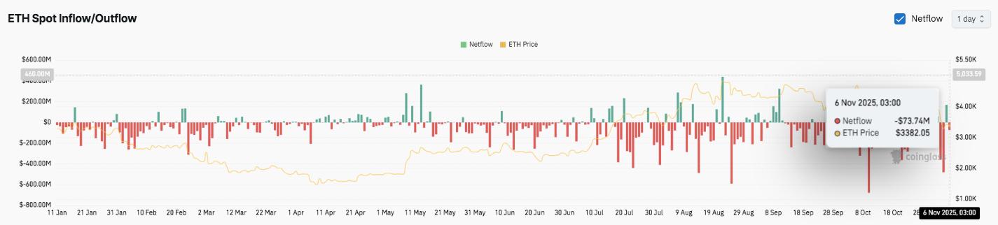 以太坊链上数据显示,资金净流入持续为负,11月6日录得7374万美元的资金流出。这表明各大交易所的提现量均大于充值量。从历史数据来看,这种模式通常与资金积累趋势相符,即代币从交易所转移到冷存储。