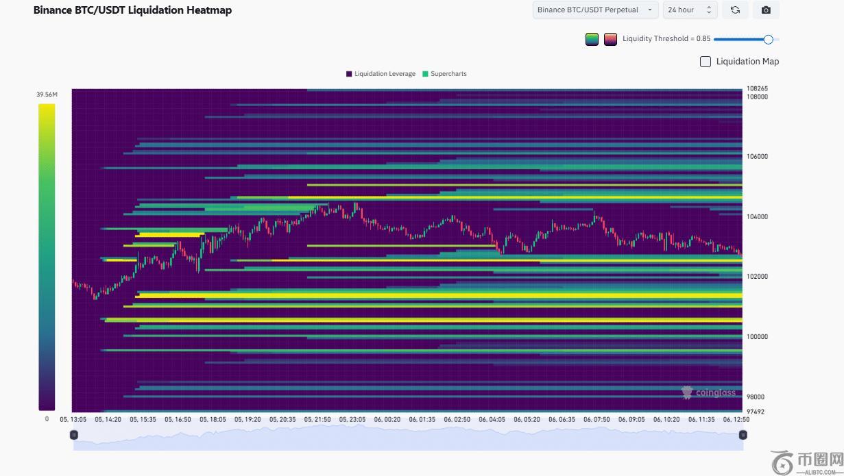 截至发稿时,BTC/USD 价格热力图显示,在 104,600 美元附近有大量卖出限价单。