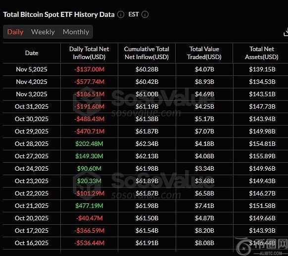 数据显示,从10月29日至11月5日,连续6天的资金外流使全市场比特币ETF净流出接近16亿美元!这一现象表明,聪明钱正在悄然撤离。