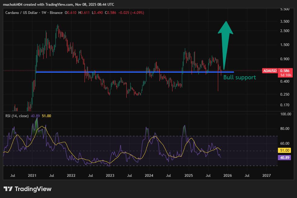 Cardano 的价格已重新测试并从 0.55 美元附近的支撑位反弹。自 2024 年以来,该区域一直扮演着关键支撑的角色,尽管价格偶尔会跌破该区域后又反弹。因此,如果 ADA 价格在未来几周内继续保持在当前流动性水平之上,那么关于其价格即将迎来抛物线式上涨的说法将得到证实。