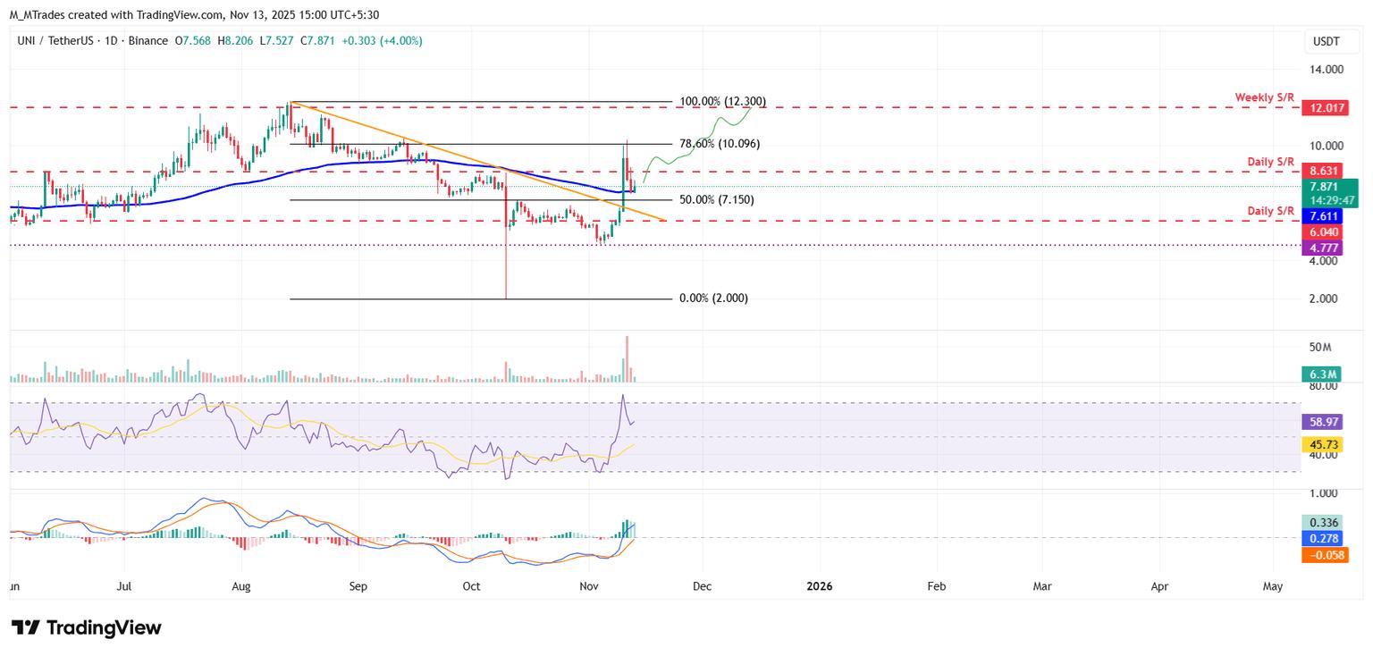 如果 200 日均线 7.61 美元继续保持有效,UNI 股价可能会继续上涨,直至触及 12.01 美元的周线阻力位。