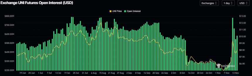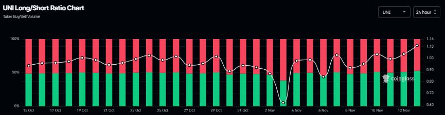 衍生品方面,Coinglass数据显示,UNI的多空比周四达到1.10,创一个月以来新高。该比率高于1表明,更多交易者押注Uniswap价格上涨。
