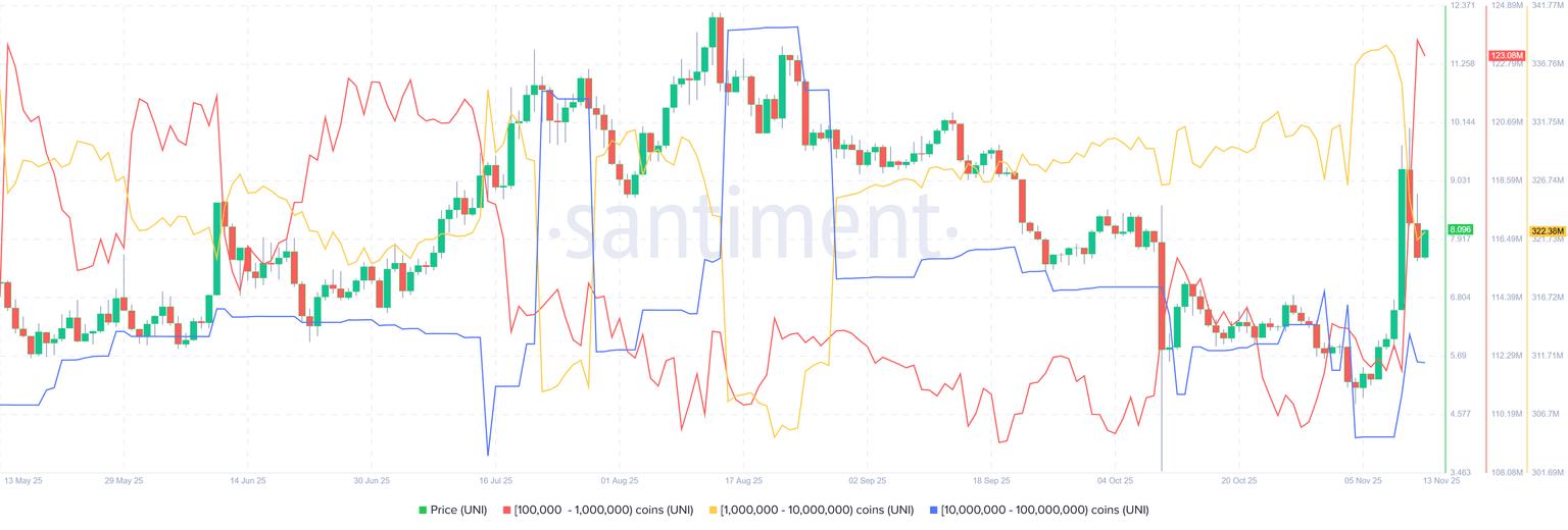 Santiment 的供应分销数据支持看涨观点前景对于 Uniswap 而言,部分巨鲸正在买入 UNI 代币。数据显示,持有 10 万至 100 万 LINK 代币(红线)和 1000 万至 1 亿 LINK 代币(蓝线)的巨鲸在周日至周四期间共计增持了 1603 万 LINK 代币。同期,持有 100 万至 1000 万 LINK 代币(黄线)的钱包则减持了 1509 万 LINK 代币。这表明第二批巨鲸可能在此次抛售潮中遭受了损失。相比之下,第一批巨鲸则抓住了机会,以折扣价增持了 Uniswap 代币。