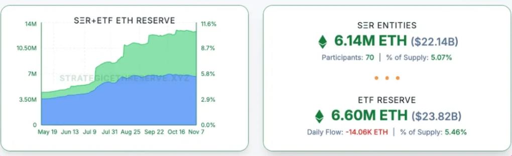 以太坊也在经历类似的转型,只是路径有所不同。数据显示,所有ETH中约11%由DAT和ETF持有,正快速追赶BTC的17.8%。