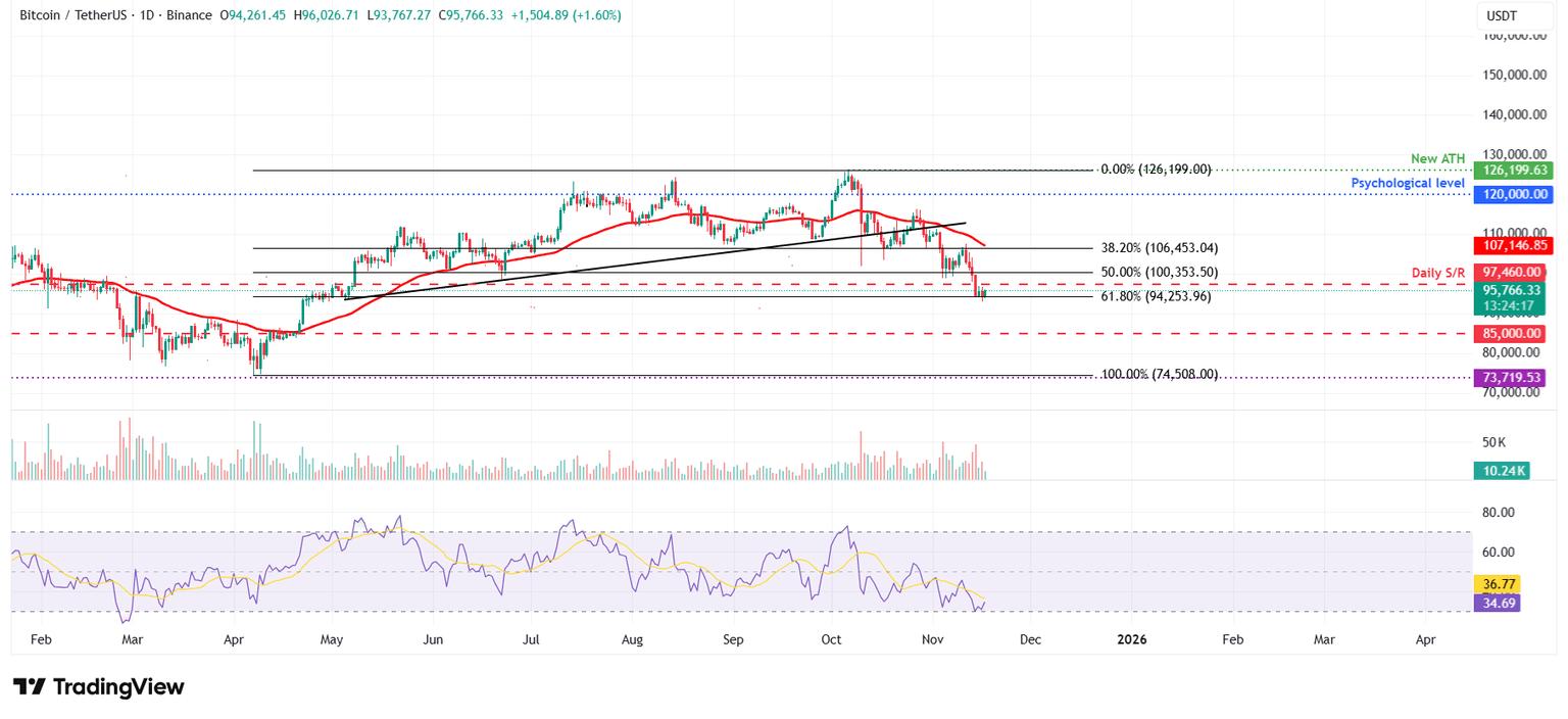 如果比特币在 94,253 美元附近的 61.8% 斐波那契回撤位找到支撑,则可能延续反弹势头,向 38.20% 斐波那契回撤位迈进。斐波那契回撤位在 106,453 美元。