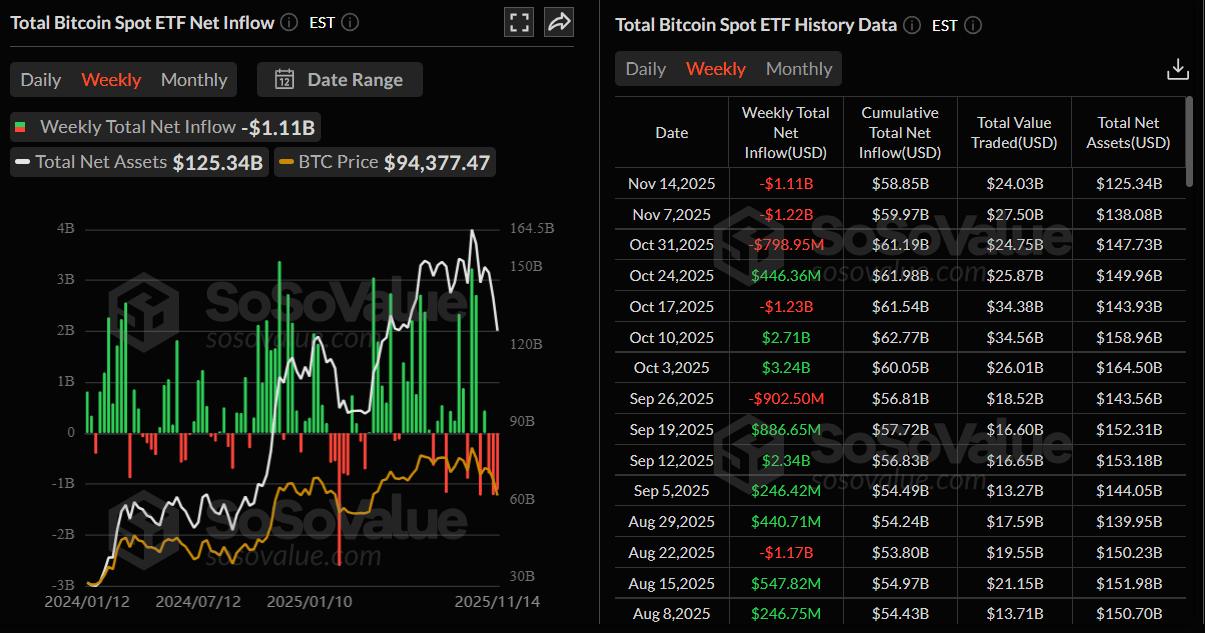 比特币机构需求持续疲软。SoSoValue数据显示,截至11月14日,现货比特币ETF累计资金流出11.1亿美元,这是连续第三周出现资金流出。如果资金流出持续并加剧,比特币当前的价格回调可能会延长,这表明机构信心正在下降。