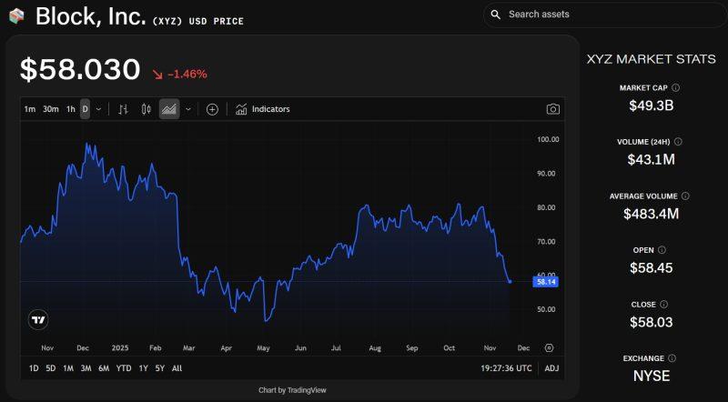 Block股票(股票代码XYZ)延续了三周的下跌趋势,今日交易价格略高于58美元——较上月下跌超过27%,当时该股一度跌破80美元。The Block 的价格页面此次下跌基本与比特币的走势一致,比特币价格从超过 12.6 万美元的历史高位回落至约 9.3 万美元。然而,威廉·布莱尔的分析师预测,XYZ 的价格在未来一年内可能会回升至 90 美元以上。