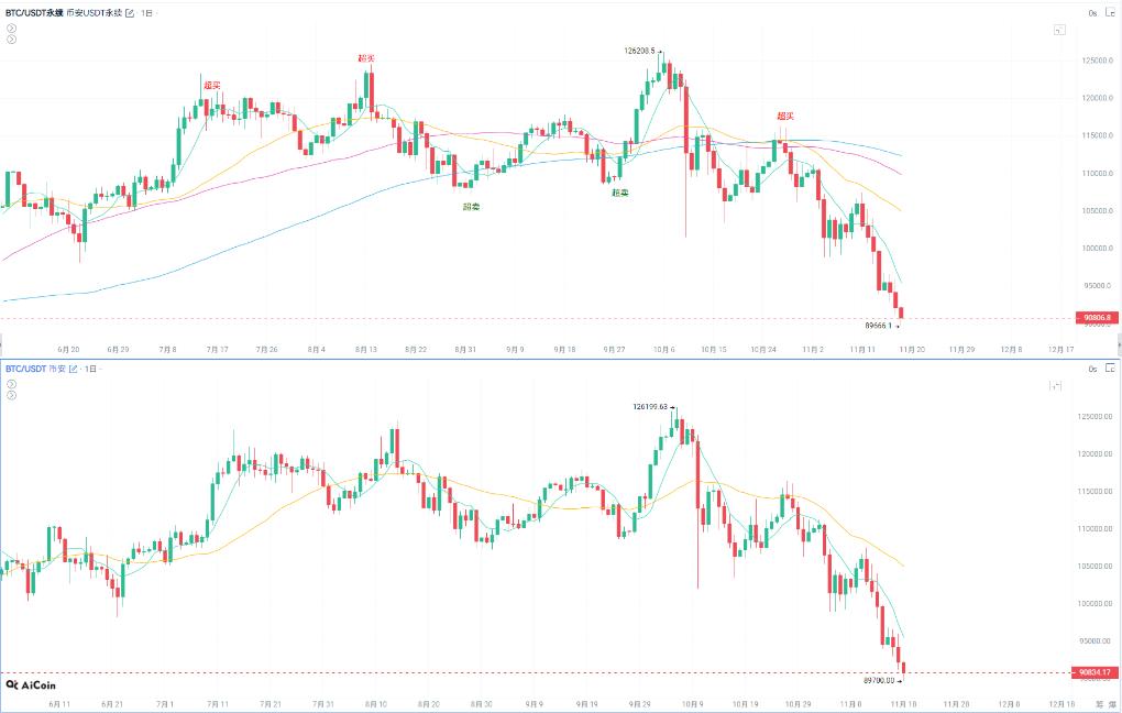 比特币正经历一场自由落体式的下跌。截至11月18日,比特币价格已跌破9万美元大关,最低触及89253美元。这一价格标志着比特币抹去了2025年全部涨幅,较去年10月创下的历史高点下跌超过27%。