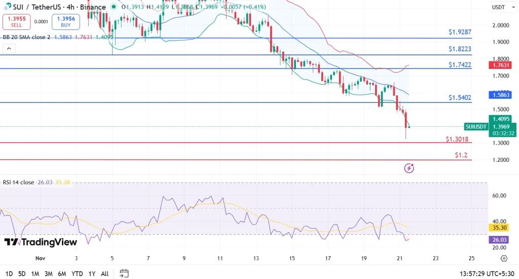 Sui 也面临着同样的惨淡局面,股价跌至 1.40 美元,日跌幅达 14.25%,周跌幅高达 23%。跌破 1.71 美元后出现的强制平仓,加上恐慌与贪婪指数飙升至 11,都表明市场一片恐慌。图表显示关键支撑位在 1.30 美元,超卖相对强弱指数 (RSI) 已降至 26,成交量也上升了 39%,这意味着一些急于抛售的投资者可能正在将股票卖给实力更强的买家。