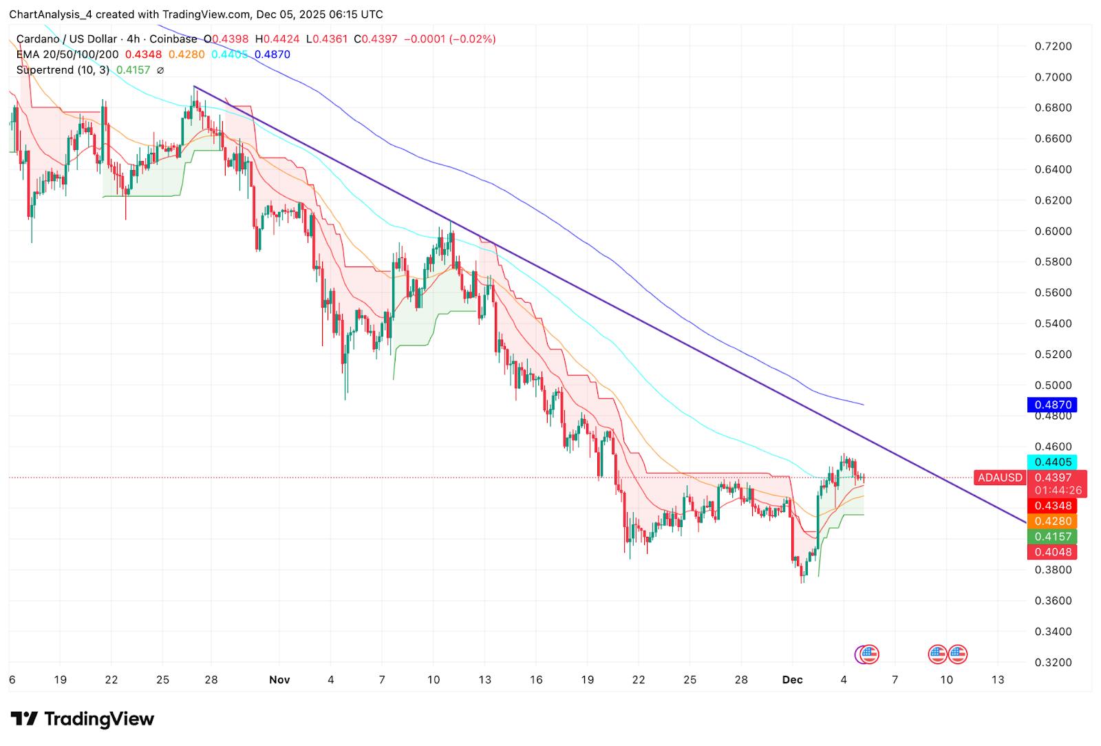 卡尔达诺价格今日在0.44美元附近交易,此前价格从数月低点短暂反弹,但未能突破自8月以来一直阻碍涨势的下降趋势线。此次反弹缓解了卖方的压力,但并未改变整体结构,目前价格正逼近阻力位,卖方已多次介入。