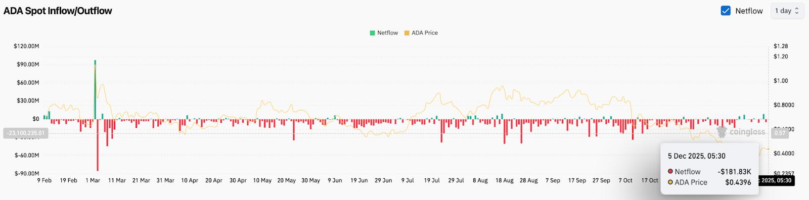 布林带显示价格正从下轨反弹,并向 0.48 美元附近的中轨方向移动。该区域与趋势线重合,形成了一个密集的阻力区。历史上,如果没有成交量和资金流的推动,ADA 很难突破该区域。