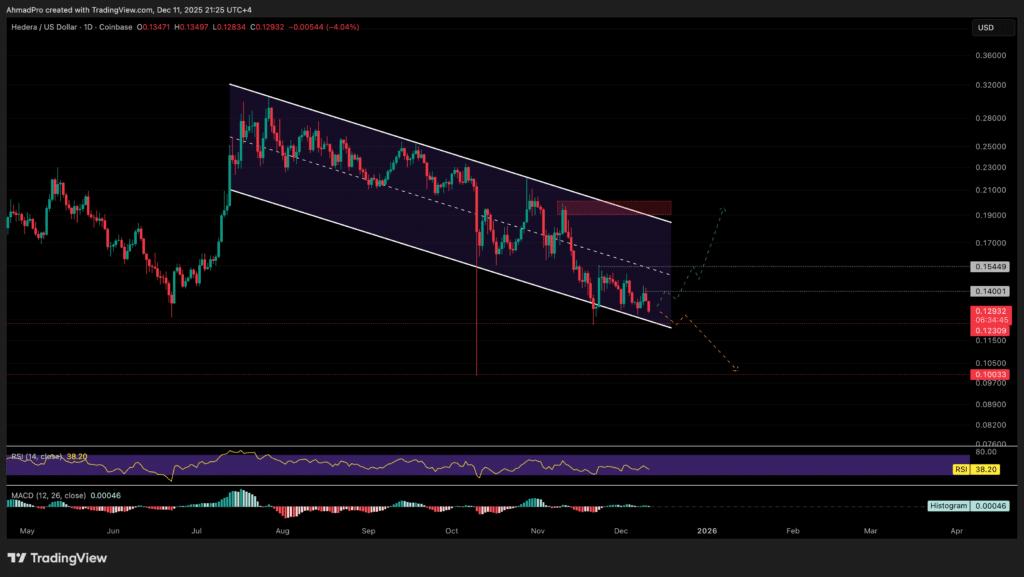 相对强弱指数 (RSI) 接近 38,表明动能疲软但尚未完全超卖,这通常预示着可能出现反弹行情。如果 HBAR 能够守住通道支撑并反弹至 0.140 美元上方,那么 0.154 美元附近的通道中部区域将成为第一个上行目标,而更大的阻力位则位于通道顶部附近。