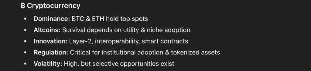 总体而言,ChatGPT对2026年的投资预测表明,市场将由基本面和创新驱动。该人工智能预测市场将呈现“看涨但选择性强”的态势,多元化投资、盈利质量和长期规划比盲目追求风险敞口更为重要,尽管波动风险依然存在,尤其是在加密货币领域。