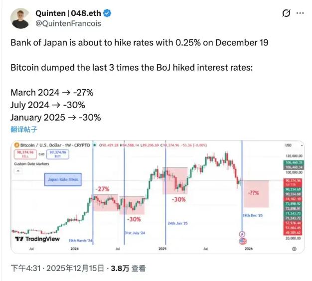 ●历史数据显示出一个清晰的规律:过去三次日本央行加息(2024年3月、7月,2025年1月)后的4至6周内,比特币均出现了20%至30% 的显著下跌。
